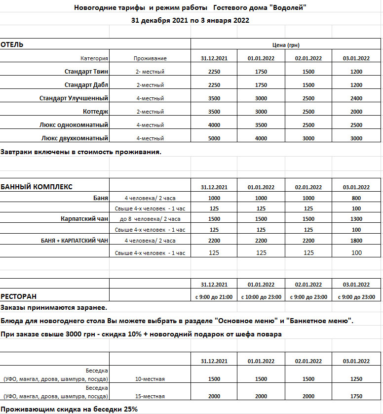 При заказе предновогоднего банкета стоимость проживания в гостинице – 350 грн с человека в сутки. В стоимость проживания включены завтраки.